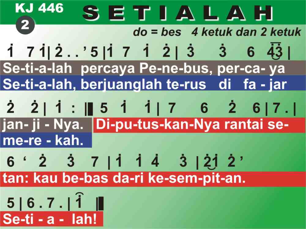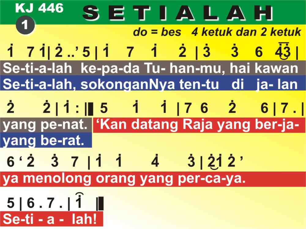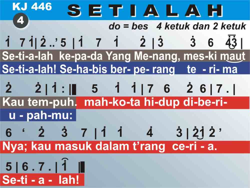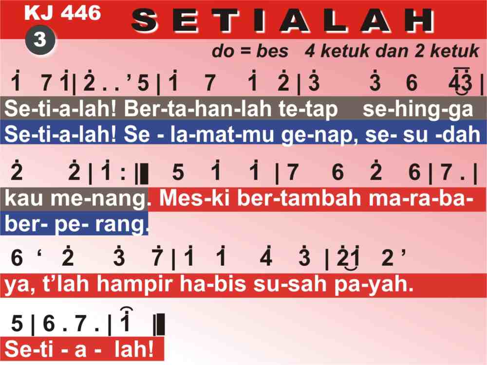 KJ. 446 SETIALAH 1. Setialah kepada Tuhanmu, hai kawan yang penat. Setialah, sokonganNya tentu di jalan yang berat. 'Kan datang Raja yang berjaya menolong orang yang percaya. Setialah! 2. Setialah percaya Penebus, percaya janjiNya. Seialah, berjuanglah terus di fajar merekah. DiputuskanNya rantai setan: kau bebas dari kesempitan. Setialah! 3. Setialah! Bertahanlah tetap sehingga kau menang. Setialah! Selamatmu genap, sesudah berperang. Meski bertambah marabaya, t'lah hampir habis susah payah. Setialah! 4. Setialah kepada Yang Menang, meski maut kautempuh. Setialah! Sehabis berperang terima upahmu: mahkota Hidup diberiNya; kaumasuk dalam t'rang ceria. Setialah!