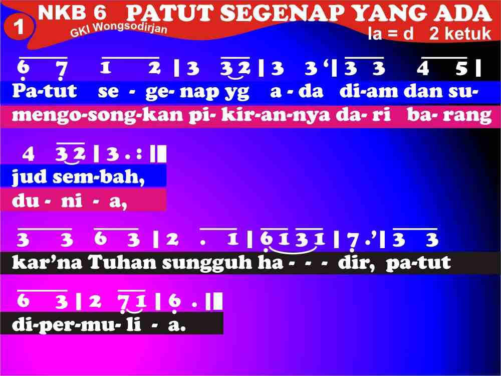NKB.6 PATUT SEGENAP YANG ADA Syair: Let All Mortal Flesh Keep Silence; Gerard Moultrie Terjemahan: H.A. Pandopo Lagu: Tradisional Perancis Patut segenap yang ada diam dan sujud sem_bah, mengosongkan pikir_annya dari barang duni_a, kar'na Tuhan sungguh ha___dir, patut dipermuli_a. Maharaja alam raya lahir dari Mari_a, Tuhan yang telah men_jadi serendah manusi_a, bagai roti yang sorga___wi memberikan diriNya. Malak mengiringi Dia, Putra Allah Yang E_sa, Cahya dari Cahya murni hadir dalam duni_a. Kuasa Iblis harus mun___dur kegelapan pun enyah. Serafim menutup wajah, Kerubim sujud sem_bah sungkem di hadapan Dia dan menyanyi tak le_lah: Haleluya, Halelu___ya, Tuhan Mahamulia!