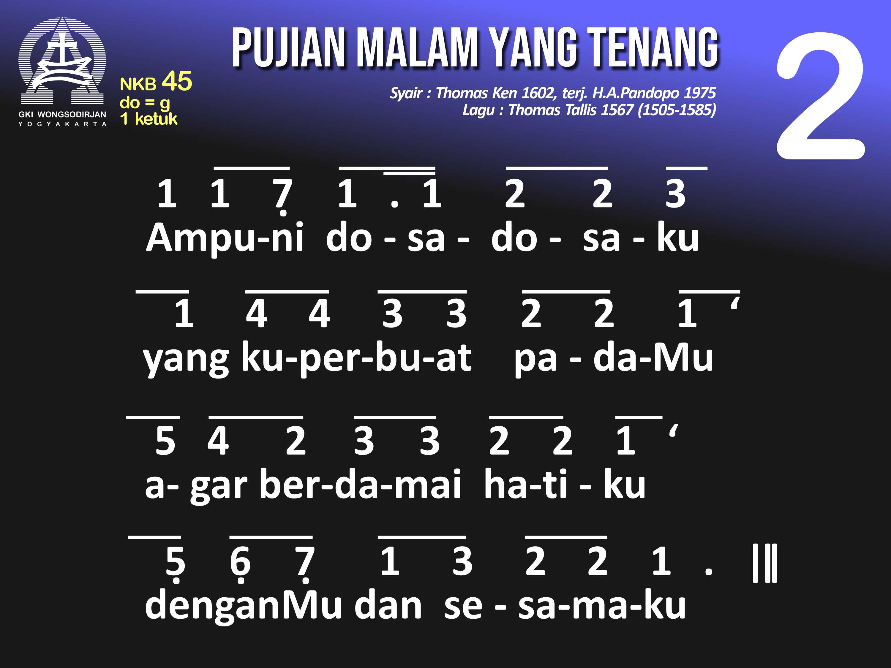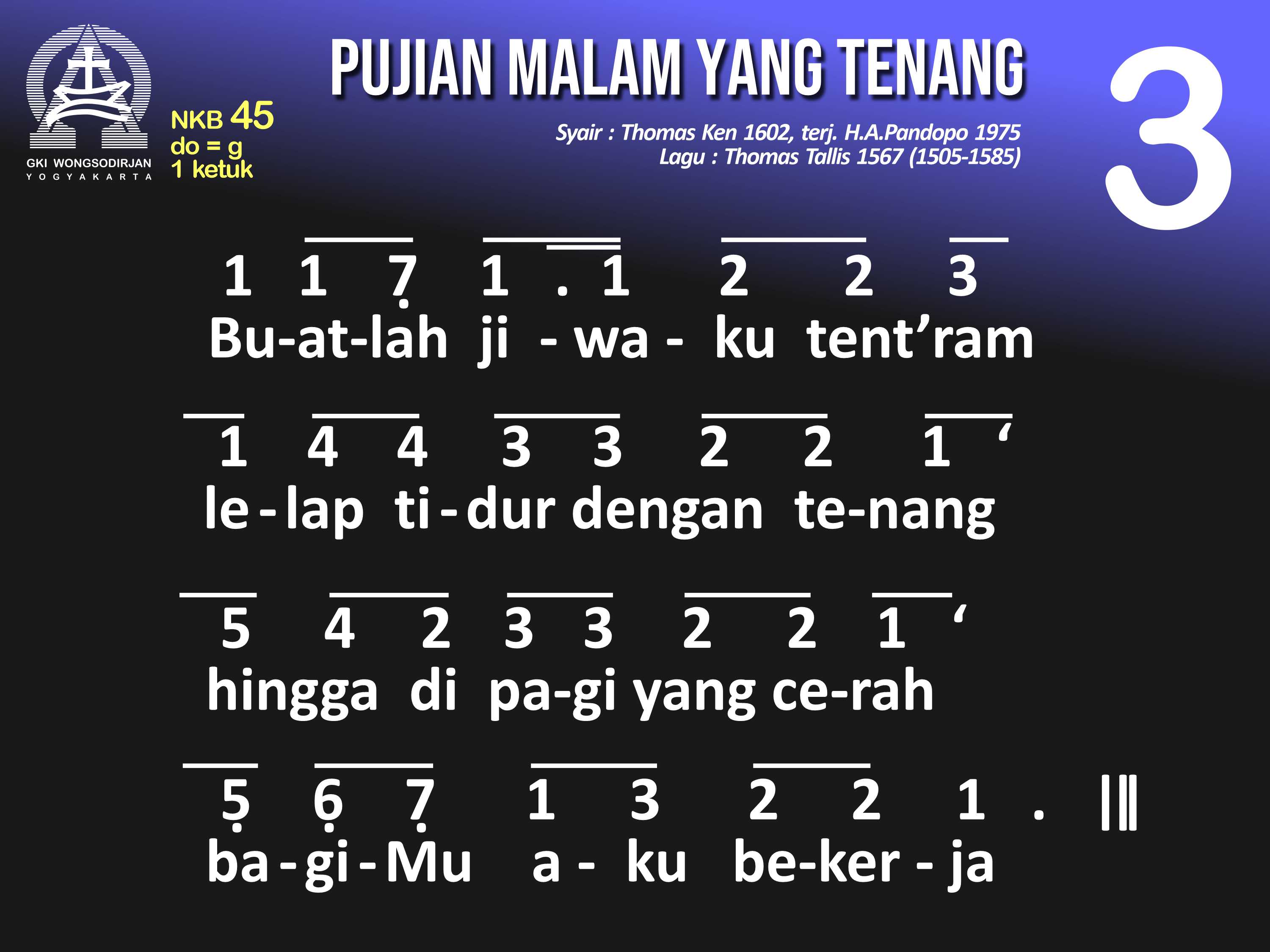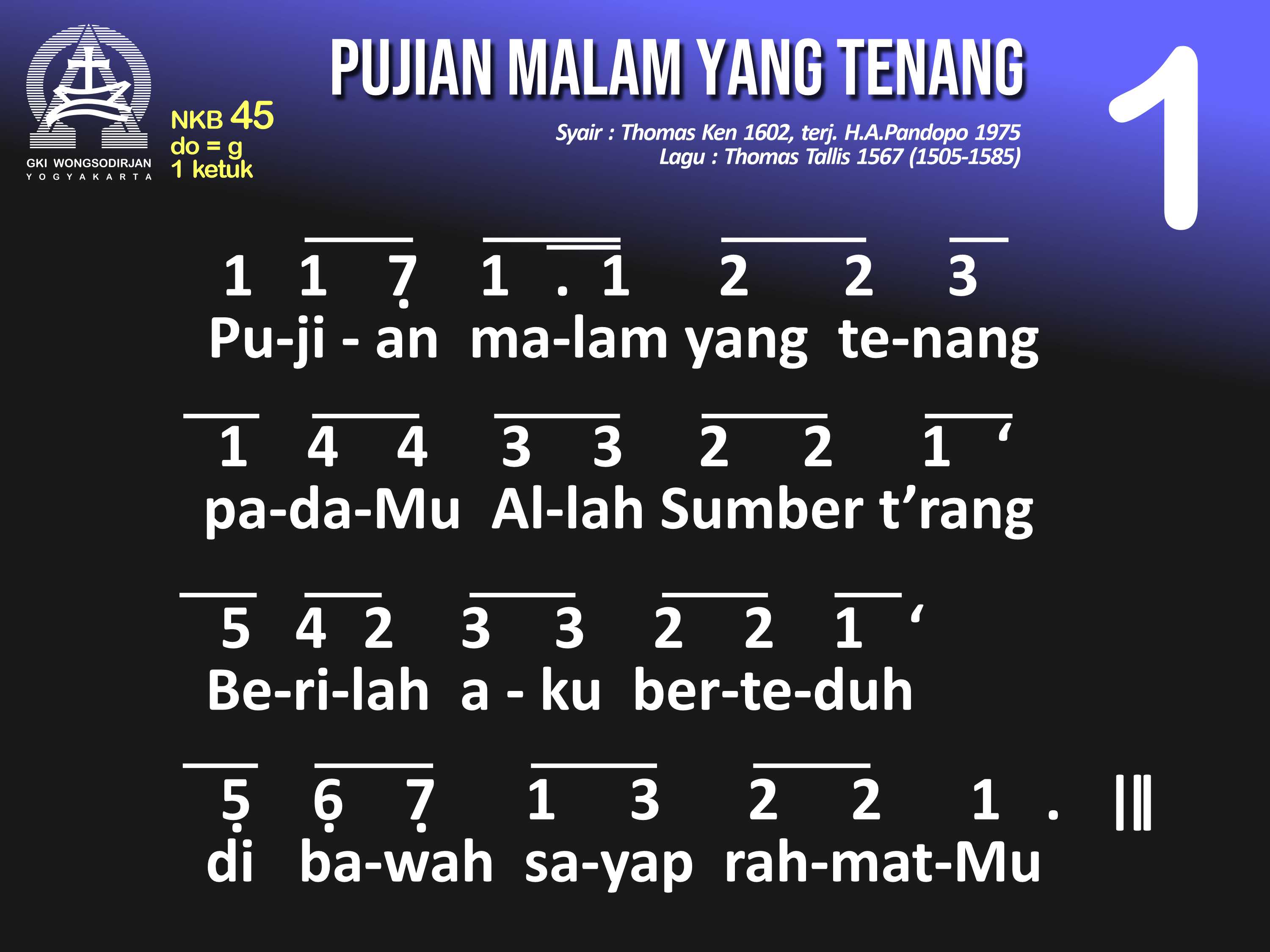 NKB.45 PUJIAN MALAM YANG TENANG Syair: Glory to Thee, My God, This Night; Thomas Ken Terjemahan: H.A. Pandopo Lagu: Thomas Tallis Pujian malam yang tenang padaMu, Allah, Sumber t'rang. Berilah aku berteduh di bawah sayap rahmatMu. Ampuni dosa-dosaku yang 'ku perbuat padaMu, agar berdamai hatiku denganMu dan sesamaku. Buatlah jiwaku tent'ram lelap tidur dengan tenang, hingga di pagi yang cerah, bagiMu aku bekerja. Jika gelisah tidurku, berikanlah sentosaMu. Jauhkan mimpi yang seram, agar tidurku pun tent'ram. Nanti pun malam 'kan lenyap diganti siang yang tetap, puji-pujian dariku, tak putus-putus bagiMu! Pujilah Khalik semesta, Sumber segala kurnia, sorga dan bumi puji t'rus, Sang Bapa, Putra, Roh Kudus.