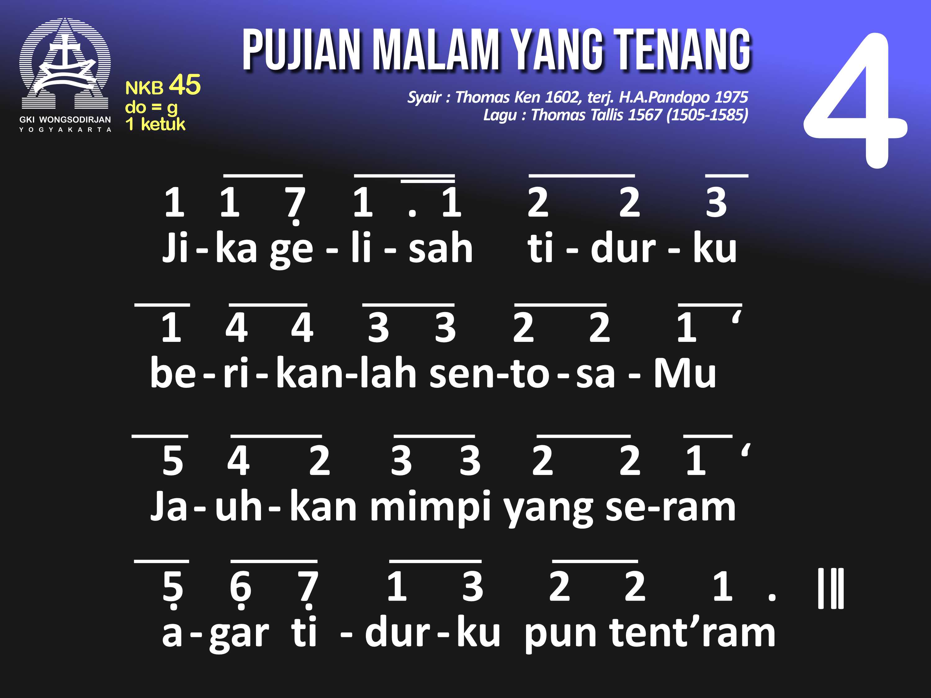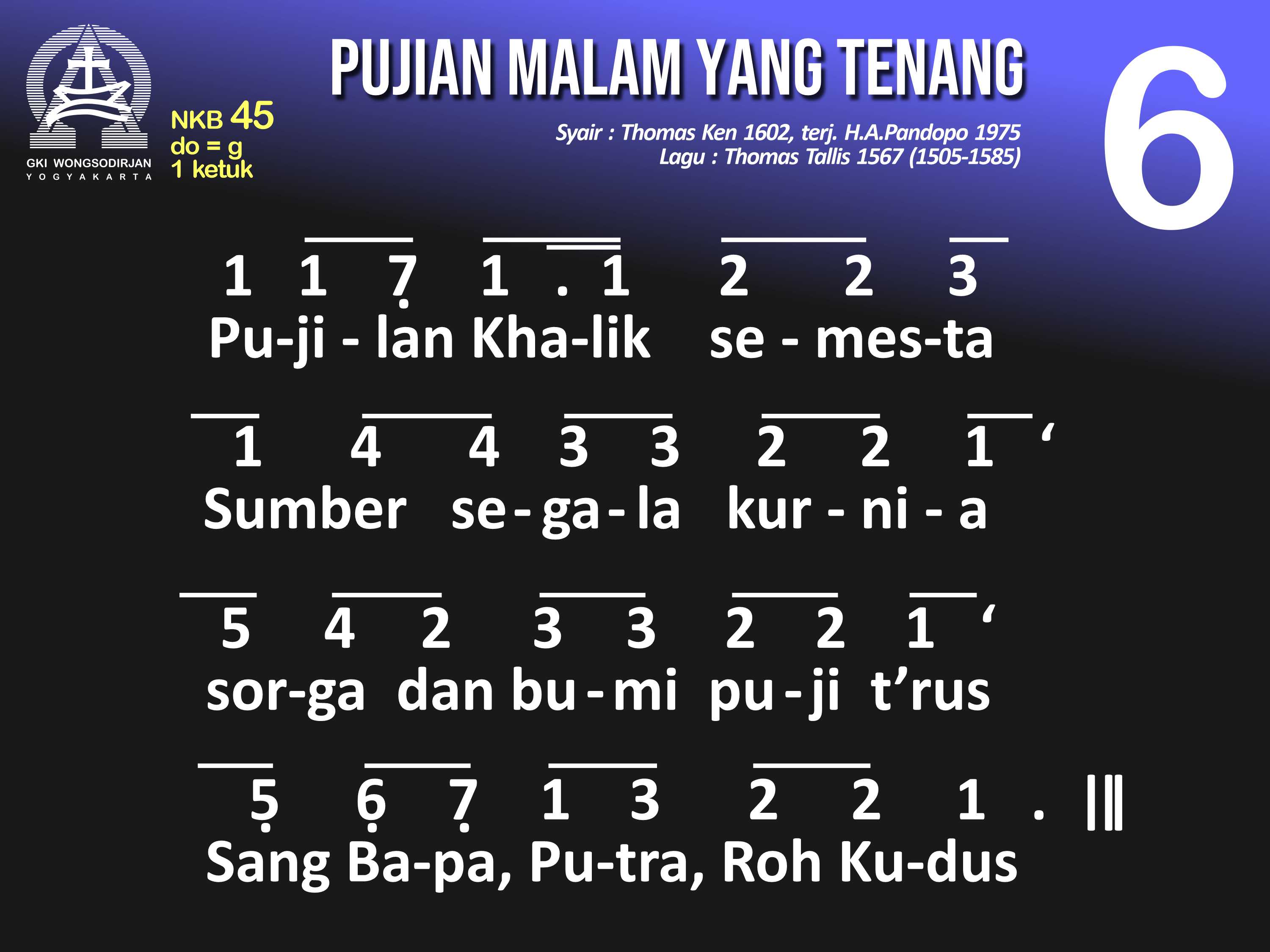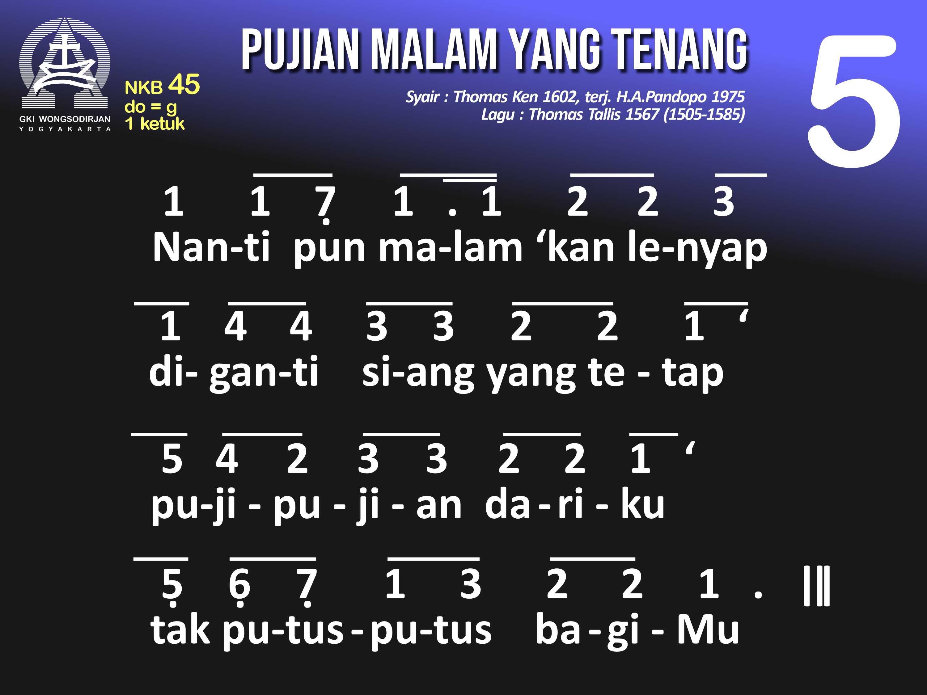 NKB.45 PUJIAN MALAM YANG TENANG Syair: Glory to Thee, My God, This Night; Thomas Ken Terjemahan: H.A. Pandopo Lagu: Thomas Tallis Pujian malam yang tenang padaMu, Allah, Sumber t'rang. Berilah aku berteduh di bawah sayap rahmatMu. Ampuni dosa-dosaku yang 'ku perbuat padaMu, agar berdamai hatiku denganMu dan sesamaku. Buatlah jiwaku tent'ram lelap tidur dengan tenang, hingga di pagi yang cerah, bagiMu aku bekerja. Jika gelisah tidurku, berikanlah sentosaMu. Jauhkan mimpi yang seram, agar tidurku pun tent'ram. Nanti pun malam 'kan lenyap diganti siang yang tetap, puji-pujian dariku, tak putus-putus bagiMu! Pujilah Khalik semesta, Sumber segala kurnia, sorga dan bumi puji t'rus, Sang Bapa, Putra, Roh Kudus.